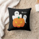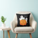 Een gooi kussen voor uw huis Halloween decor, die de essentie van het seizoen vastlegt met een heerlijk verlichte pompoen omringd door speelse geesten, allemaal vrolijk uitroepend, Boo!