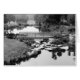 Un petit pont de bois enjambe un lac qui ressemble à un miroir, reflétant les nombreux arbres qui l'entourent. De gros rochers blancs peuvent servir de stepping, et un petit cottage surplombe, drapé de verdure.
