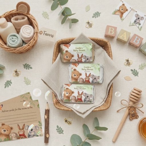 Add a cute and memorable touch to your celebration with this woodland animals baby shower acrylic keychain. This sweet design features adorable animals like a fox, bear, bunny, and koala with soft greenery on a light background.
