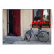 Cette charmante photographie a été prise à Bruges, en Belgique et montre une bicyclette bleue garée sous une vitrine colorée remplie de fleurs rouge vif. La porte d'entrée rouge et profonde à côté de celle-ci est accolée, ce qui laisse penser à l'accueillante maison située au-delà. L'intérieur de la zone de message de la carte est vide, mais vous pouvez la personnaliser en cliquant sur le bouton "Customiser !" et en ajoutant votre propre texte si vous le souhaitez. Le haut de la carte indique : "Bruges, Belgique" et "La ville de Bruges, célèbre pour sa dentelle artisanale, est la capitale de la province de Flandre Occidentale. Le centre historique, où une grande partie de l'architecture médiévale est encore intacte, a été classé au patrimoine mondial de l'UNESCO et abrite des milliers de cyclistes."