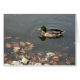 Des feuilles de chêne bordent le rivage comme un canard nage.