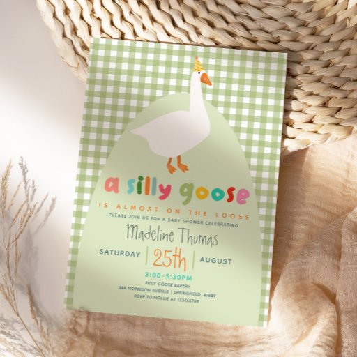 Welcome guests with this whimsical Silly Goose baby shower welcome poster. Featuring a charming goose illustration, colourful “a silly goose is almost on the loose” lettering, and a modern sage green gingham background. Perfect for a gender-neutral, farmhouse, or storybook-themed baby shower. Easily personalise with the mum-to-be’s name and event details for a sweet, cohesive setup.
