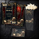 Élégance gothique foncée. Arche étonnante soutenue par deux piliers majestueux finit dans une finition sombre. Ces piliers sont couverts de lierre, dont les feuilles verts offrent un contraste éclatant avec les matériaux sombres. À la base de l'arcade se trouvent trois crânes humains dépeints de façon réaliste, entourés de lierre. Ces éléments apportent une signification plus profonde au design et rappellent la transition de la vie et la force de l'amour qui perdure même au-delà de la mort.