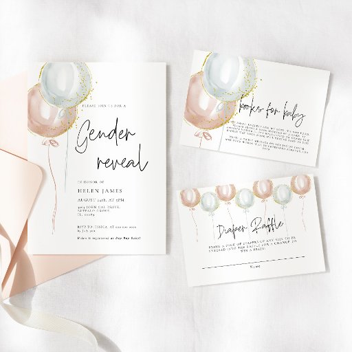 Dévoilez la surprise : Élever votre sexe révèle le baby shower avec les invitations de ballons rose et bleu et collection de décors. Orné de polices de caractères fantaisistes et de délicates taches d'or, les invitations enchanteresses, la signalisation et le décor préparent le décor à une fête magique. Laissez l'anticipation joyeuse prendre vie alors que vous rassemblez vos proches pour partager le moment. #zazzlemade