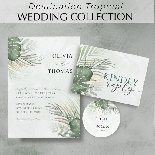 Design tropical élégant, avec des feuilles de monstère et de palme dans une gamme de verdure douce avec ajout de ligne d'or. Customisez pour en faire votre unique signe mariage.