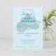 Design front features a pale blue background to the image of delicate crocheted baby booties in center. Name of guest-of-honor is displayed in an elegant, ocean blue font. Event heading is featured below in bold. An elegant flourish borders design.