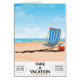 Prenez un Vacances "C'est plus rapide en train" affiche de vacances à la plage de style Vintage d'un transat à rayures vintage et d'un ballon de plage sur une plage de sable chaud au bord de l'océan.