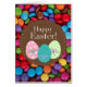Perfect voor Pasen voor kinderen of kinderen in de ziel met Happy Easter logo met kleurrijke eieren tegen een achtergrond van chocolade smarties regenboog snoep.