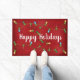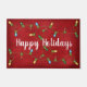 Een kleurrijke reeks kerstlichten op rood met Prettige feestdagen tekst.