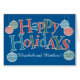 Prettige feestdagen Een leuke, op tekst gebaseerde kaart om te personaliseren op de voorkant, met Ornamenten en letters, gevuld met rode, blauwe en groene chevrons en stippen, omlijnd in wit op een helderblauwe achtergrond. Vergeet niet dat je ook de inside message kunt personaliseren.