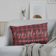 Op maat ontworpen decoratief lumbaal kussen met "HappyHolidays" of uw keuze van tekst in moderne borstelscript / handkalligrafie met gepersonaliseerde familienaam op een feestelijk zwart en rood buffel check / plaid / gingham check patroon. Vakantie/Kerstmis gepersonaliseerde home decor. Landhuis boerderij home decor ideeën.