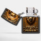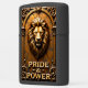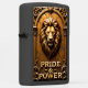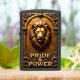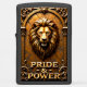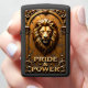 This dimensional lighter features a realistic lion's head and mane in an architectural frame. The design is dominated by shades of gold, bronze, and copper. The lion is centered within a gold arch or niche, set against a cracked, rustic background. Highly detailed scrollwork frames the lower portion of the design. The phrase "PRIDE & POWER" is set in stylized gold block lettering. The design is set on a matte black lighter casing. The design may look real due to the high detail and three-dimensional texture in the artwork.