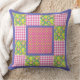 Een Sierkussen of kussen met een patroon van diepe roze, violette blauwe en gele primrozen op een bladgroene achtergrond, voorzien van een diepe roze en witte check gingham en een patroon van gele primroses en groene polka stippen op een diepe roze achtergrond; van het collectie "Primroses" uit Posh & Painterly.