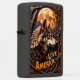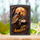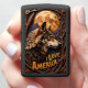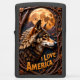 This lighter features a carved, high-relief profile portrait of a wolf set against a large, bright orange moon. The entire scene is framed by thick, intertwining carved branches and foliage. The words "I LOVE AMERICA" are displayed in a banner beneath the wolf's head. The design uses a dark brown, black, and bright orange color palette. This detailed wildlife piece is set on a matte black lighter casing. The design may look real due to the high detail in the artwork.
