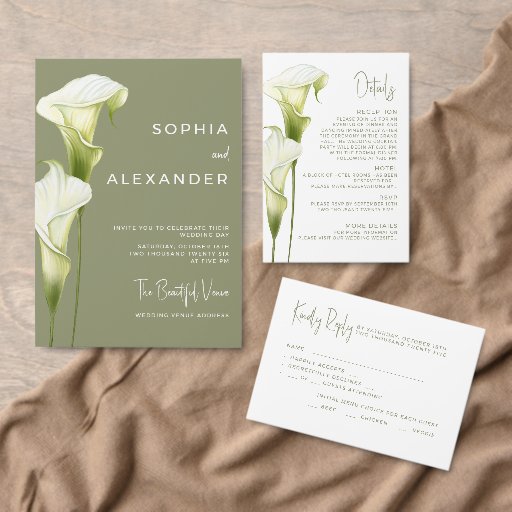 This flat lay wedding program features a sophisticated, minimalist style. Delicate calla lilies in soft green hues are depicted against a light background, creating an atmosphere of sophistication and tranquility. The design is modern, airy, and perfect for a stylish, romantic wedding.