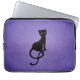 Manche d'ordinateur portable de chat noir avec une belle illustration d'un chaton noir gracieux avec des yeux brillants sur un arrière - plan violet texturé grunge.