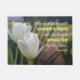 Zacht witte en gele tulpfoto met Proverbs 31:25, ze is met kracht en waardigheid geklokt en ze lacht zonder angst voor de toekomst.