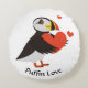Puffin Love Red Hearts Sierkussen met aanpasbare tekst.