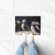 Foto van vier puffins die in tegengestelde richting op stenen op de Faeröer in Northumberland kijken.