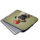 Grappige Pug met een appel die op zijn hoofd balanceert.
