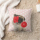 Pug Puppy holding Red Carnance Monogram Pillow.