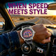 This bold watch face features a vintage-style purple hot rod car, its lower half engulfed in vibrant orange and yellow flames, appearing to speed across a dark, reflective road. The black background emphasizes the intense motion and fiery elements of the car, creating a powerful and dramatic design for automotive enthusiasts.