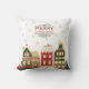 Een feestelijk gooien kussen van een schilderachtig Victoriaans dorpje, zijn charmante huizen gekleed in feestelijke vakantie decor, elk raam uitstralend een warme, uitnodigende gloed met gouden sneeuwvlokken vallen op de achtergrond en de tekst - Vrolijk kerstfeest - aan de bovenkant.