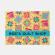 Welkom klanten in uw quilt-winkel of bedrijf met deze kleurrijke deurmat die is gepersonaliseerd met uw bedrijfsnaam. U kunt de naam of andere woorden voor uw deuringang gemakkelijk aanpassen. Deze deurmat is geweldig voor het promoten van uw quilt lappendeken zaken en show die liefde drijven en is ook geweldig voor een quild- of quilt-klasse. De klantgerichte bedrijfsnaam is op een turquoise aqua blue strip en kan gemakkelijk aan een ander woord zoals een guild naam worden aangepast. Deze originele quilt-kunst combineert favoriete quilt-blokken, zoals een blokhut, sterren en pinkels, plus unieke blokken om een dun design te vormen met levendige en dynamische kleuren die op een zwarte achtergrond poppen. De blokkleuren zijn groen, geel, roze, oranje, rood, en turquoise blauw. Kleine gele bloemen bevinden zich op de achtergrond tussen de blokken. Volledig aanpasbare Quilt art is van stof en quilt ontwerper Phyllis Dobbs en is gemakkelijk om het uw eigen te maken.