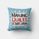 "Making Quilts Is My Jam" is een schattig tekstontwerp in blauw met zwarte en rode tekst, samen met een witte accentvorm en witte gestructureerde grillige stippen eromheen.