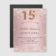 Une invitation magnétique pour une élégante Quinceañera, fête du 15ème anniversaire. Arrière - plan de dégradé rose vif. Décoré avec de la poussière de parties scintillant en faux or rose. Personnalisez et ajoutez un nom et des détails du parti. Le nom est écrit avec un script de style écrit à la main. Le numéro 15 est écrit avec une police de style ballon. À la fois comme invitation et un rappel Save the Date pour vos invités!