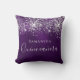 Een kussen voor een Quinceañera, 15-jarige meisjeskamer. Een kleine paarse achtergrond faux zilverglitterstof. De paarse kleur is ongelijk. De tekst: Quinceañera wordt in wit geschreven met een groot modern, met de hand geschreven stijlscript. Pas een naam aan en voeg deze toe.