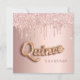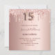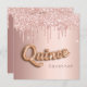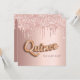 Pour une luxueuse Quinceañera, fête de 15 ans. Un arrière - plan d'or rose avec de l'or rose et des gouttes roses, la peinture goutte à goutte. Le texte : Quince est écrit avec une police de style bulle. Personnalisez et ajoutez un nom et des détails du parti