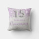 Een kussen voor een Quinceañera, 15e jaar oude meisjeskamer. Een faux zilver metallic uitziende achtergrond met paarse faux glitter druppels, vlekken. De tekst: Quinceañera is geschreven in het paars met een groot modern handschrift. Een naam personaliseren en toevoegen. Nummer 15 is geschreven met een ballonstijl lettertype.