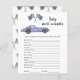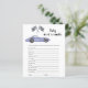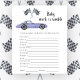 Race auto thema baby shower uitnodigingskaart met waterverf illustraties van een paarse (violette) vintage auto en zwart-wit race vlag. "Race op over voor een baby shower." ANTWOORDEN: VERLANGENS, HUILEN, FLES, NACHTLICHT, SLAAP, KINDERWAGEN, EPIDURAAL, BOER, HOGE STOEL, LUIERTAS, SWADDLE