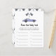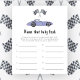 Race auto thema baby shower uitnodigingskaart met waterverf illustraties van een paarse (violette) vintage auto en zwart-wit race vlag. "Race op over voor een baby shower."