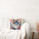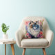 Gooi kussen beschikt over delicate waterverf kunstwerk van een prachtige lappenpoppenkat omringd door bloemetjes in een vrouwelijk esthetisch dierenportret. De blauwogige katachtige kijkt van de zijkant in dit levendige bloemenschilderij.