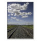 Een spoorwegbed met twee sporen vervaagt de afstand onder een grote Montana-hemel.