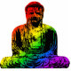 Een gestileerde afbeelding van een boeddha-standbeeld in regenboogkleuren.