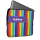 Deze heldere, rainbooggestreepte laptophoes heeft een paars bannerlint met witte stikkende details over de bovenkant. Het is gepersonaliseerd met een naam of een tekst die u wilt toevoegen.