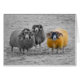 Trois RAM écossaises posant pour l'appareil-photo. Deux noirs et moutons blancs avec une RAM colorée jaune-orange simple avec les klaxons très bouclés.