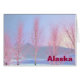 Digitaal schilderen van met sneeuw bedekte berkenbomen; de sneeuw is roze door de staande zon. Er verschijnt ook een tekst met de tekst "Alaska". Hier in het noorden is het gebruikelijk dat met sneeuw bedekte bomen roze of oranje raken door de zon die aan de horizon laag hangt.