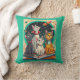 Throw pillow in an illustration of four cats sitting on an open book, gazing at a rocket soaring through a cosmic backdrop. Each cat sports retro-futuristic space gear, blending vintage sci-fi charm with whimsey. The scene evokes wonder, adventure, and imagination fueled by books.