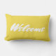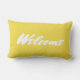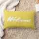 Ce coussin lombaire jaune indique le "accueil" dans les lettres blanches. Le texte peut être changé en vos mots désirés tels qu'un nom ou une salutation différente.