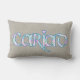 Un coussin lombaire amusant avec le mot gallois "cariad" dans un script celte, rempli d'un joli motif floral souligné en bleu vif sur un arrière - plan de couleur hessienne (burlap).