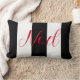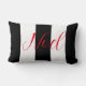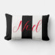 Ce coussin lombaire de vacances comprend le mot "Noel" en texte rouge sur un motif aux épaisses bandes verticales noires et blanches.