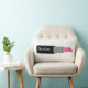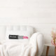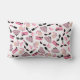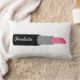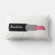 Un coussin avec un design composé de lunettes de soleil pour chat rose et noir rétro, des sacs à monnaie rose avec pois gris, des sacs à main rose avec arc noir, des rouges à lèvres roses, des pierres précieuses roses et une bouteille de parfum avec atomiseur rose. L'avant est orné d'une grande illustration de rouge à lèvres rose. Personnalisez avec votre nom sur rouge à lèvres.