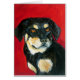 Het portret van een hond tegen een rode achtergrond. Schilderen in acryl.