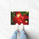 Het kunstwerk op deze Deurmat is een originele foto van ZoeSPEAK van een rode hibiscusbloem. Op de foto wordt het midden van de bloei gestraald door zeer fel zonlicht dat door een opening tussen de geelgroene bladeren van de struik gluurt. De gele meeldraad wordt omringd door de felrode bloemblaadjes van de bloem, die er geel uitzien waar de zon het helderst is. De rest van de bloem herfsten in de schaduwen in een dieprode kleur tegen de olijfgroene bladeren. Er staat een gele sticker met het woord "Welkom" erop. Deze items zijn ingesteld voor u om te verplaatsen, te wijzigen of te verwijderen zoals u wilt.