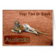 Een Red Kangaroo-bok, met een traditioneel Australisch slouch pet, ligt in de woestijn. Er verschijnt ook een bordje met tekst lezen, "Australië" in een stijl die doet denken aan het schilderen van Aboriginal-schors. Voeg je eigen aanvullende tekst toe. De Red Kangaroo (Macropus rufus) is de grootste kangoeroesoort en het grootste landdier van Australië.