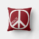 Een rode kussen met een groot wit vredesteken en aanpasbare tekst. Houd het woord rust of voeg in plaats daarvan een naam toe!